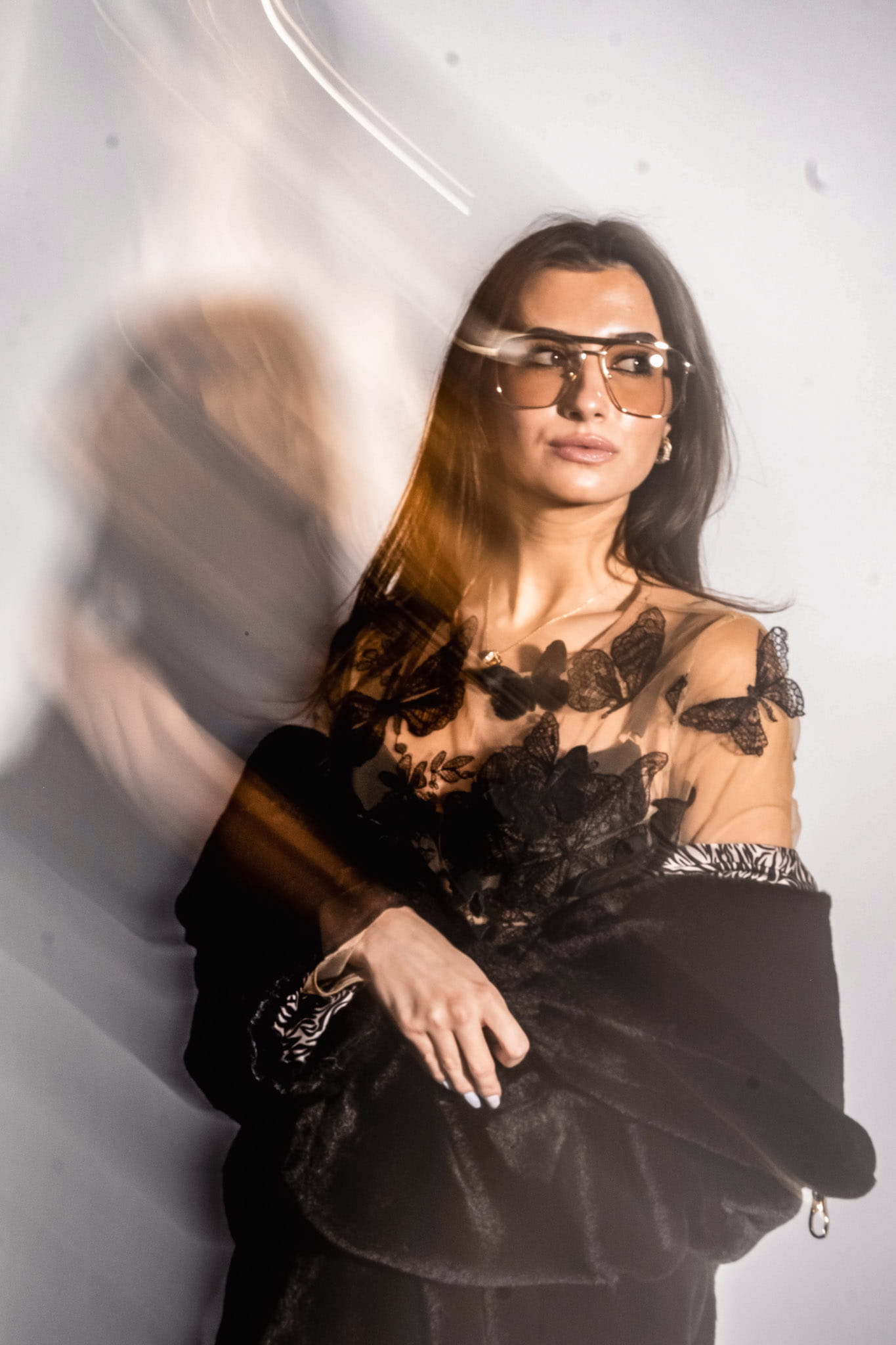 Na przodzie oraz brzegach ręcznie doszywane motyle z czarnej skóry naturalnej.